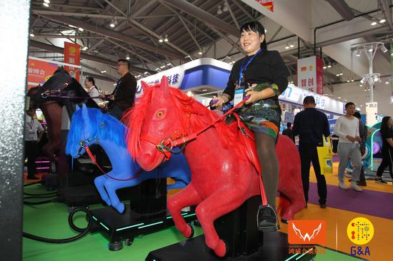 如金馬科技的GJT-60A觀景塔、ZB-72A轉(zhuǎn)轉(zhuǎn)杯、3D互動(dòng)軌道車(chē);世宇的動(dòng)感戰(zhàn)機(jī)、怪獸獵人、一球成名、糖果扭扭蛋;華立的瘋狂兔子、頭文字D ZERO、巨獸浩劫2幸運(yùn)光圈;大新的裝配式智能泳池;通利動(dòng)漫:粉紅格格禮品機(jī),海綿寶寶游樂(lè)設(shè)備;牧童的叢林水寨、皮筏滑梯、牧童繽紛水屋,日東的繽紛射球、旋風(fēng)摩托;智跑的中型懸掛過(guò)山車(chē)、彈射過(guò)山車(chē);金滿(mǎn)鴻的樂(lè)吧車(chē)、戰(zhàn)火金剛、幻影摩托;燁睿的一推天下、YOYO派對(duì);兩只老虎的翻滾車(chē)、倉(cāng)鼠球……